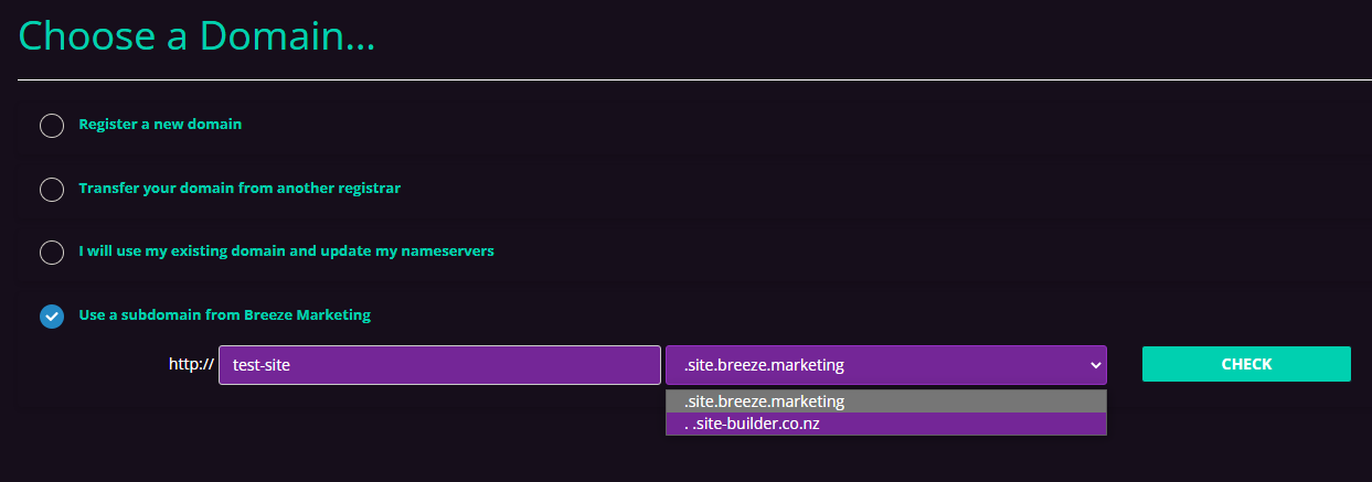 - Use a Free Subdomain - If you just want to trial the WebBuilder you can choose a free subdomain. You can add a domain at a later date or just use this one for your website.