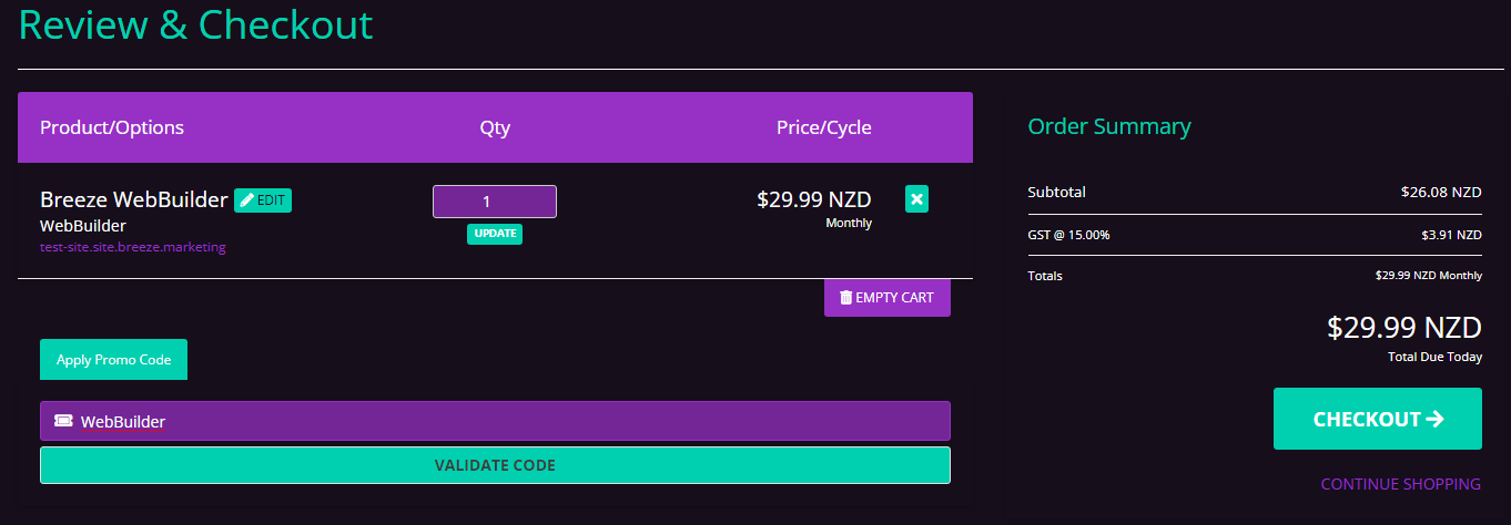 - You will see the final checkout screen, if the free trial code was not activated, be sure to enter the code WebBuilder.