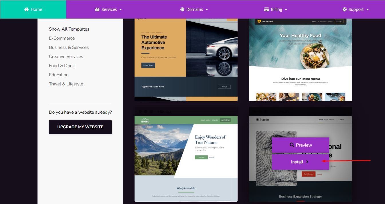 - Choose from one of our templates to get started, once you find one, hover over it and click Install.