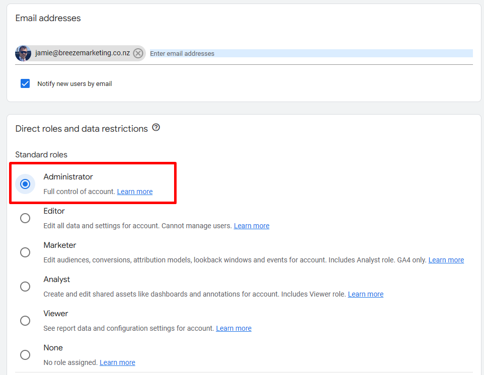 - Enter the email address of your contact at Breeze Marketing (for example jamie@breezemarketing.co.nz), choose the Administrator option under standard roles, then click Add (in the top right)